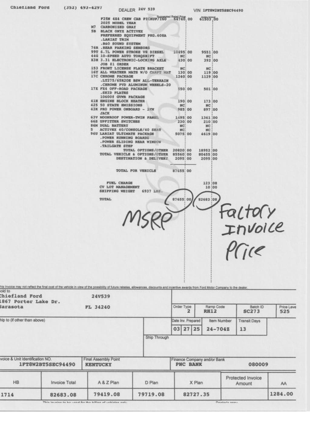 LARIAT ULTIMATE PACKAGE -inc: Pro Trailer Hitch Assist, Ford Co-Pilot 360 Assist 2.0, 360-degree camera, rear view camera and reverse brake assist, Pre-Collision Assist, Automatic Emergency Braking (AEB), pedestrian detection, forward collision warning, dynamic brake support and intersection assist, Post-Collision Braking, Lane-Keeping System, lane-keeping alert, lane-keeping aid and driver alert, Front & Rear Parking Sensors, Automatic High Beam, Adaptive Cruise Control w/Stop-and-Go, lane centering and predictive speed assist, 4-Way Adjustable Headrests, Power-Sliding Rear-Window w/Defrost, Tailgate Step & Handle, Head-Up Display, Power-Deployable Running Boards, Pro Trailer Backup Assist, trailer reverse guidance, Radio: B&O Unleashed Sound System by Bang & Olufsen, HD Radio w/14 speakers including subwoofer, FX4 OFF-ROAD PACKAGE -inc: Hill Descent Control, Off-Road Specifically Tuned Shock Absorbers, front/rear, Transfer Case & Fuel Tank Skid Plates, Unique FX4 Off-Road Box Decal, CHROME PACKAGE -inc: Unique Chrome Mirror Caps, Tires: LT275/65Rx20E BSW A/T, Spare may not be the same as road tire, Wheels: 20" Chrome PVD Aluminum, Chrome Door Handles, 6" Angular Bright Anodized Step Bars, Chrome Exhaust Tip , PRO POWER ONBOARD - 2KW -inc: dual alternators 12V 250 Amp + 24V 150 Amp, FRONT LICENSE PLATE BRACKET -inc: Standard in states requiring 2 license plates and optional to all others, ENGINE: 6.7L 4V OHV POWER STROKE V8 TURBO DIESEL B20 -inc: manual push-button engine-exhaust braking and Operator Commanded Regeneration (OCR), 250 Amp Alternator, 34 Gallon Fuel Tank, 3.31 Axle Ratio, Dual AGM 68 AH Battery, ENGINE BLOCK HEATER -inc: grille cover, DUAL AGM 68 AH BATTERY, ALL-WEATHER FLOOR MATS -inc: Doesn't include carpet floor mats, Urethane Gear Shifter Material.