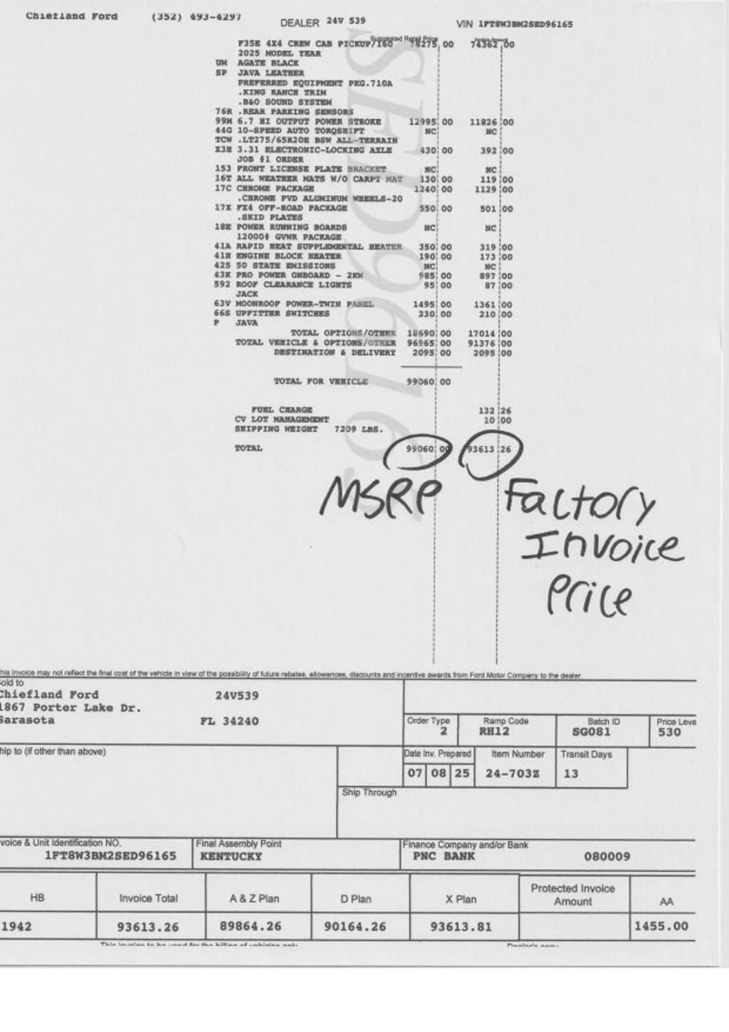 FX4 OFF-ROAD PACKAGE -inc: Hill Descent Control, Off-Road Specifically Tuned Shock Absorbers, front/rear, Transfer Case & Fuel Tank Skid Plates, Unique FX4 Off-Road Box Decal, ENGINE: 6.7L HIGH OUTPUT POWER STROKE V8 DIESEL -inc: Turbo diesel B20, manual push-button engine-exhaust braking and Operator Commanded Regeneration (OCR), 48 Gallon Fuel Tank, 250 Amp Alternator, GVWR: 12,400 lb Payload Package, 3.31 Axle Ratio, Dual AGM 68 AH Battery, CHROME PACKAGE -inc: Unique Chrome Mirror Caps, Tires: LT275/65Rx20E BSW A/T (4), Spare may not be the same as road tire, Wheels: 20" Chrome PVD Aluminum, Chrome Door Handles, 6" Angular Bright Anodized Step Bars, Chrome Exhaust Tip , RAPID-HEAT SUPPLEMENTAL CAB HEATER -inc: 410 Amp Dual Alternators, 250 Amp + 160 Amp, PRO POWER ONBOARD - 2KW -inc: dual alternators 12V 250 Amp + 24V 150 Amp, POWER-DEPLOYABLE RUNNING BOARDS, LED ROOF CLEARANCE LIGHTS, FRONT LICENSE PLATE BRACKET -inc: Standard in states requiring 2 license plates and optional to all others, ENGINE BLOCK HEATER -inc: grille cover, ALL-WEATHER FLOOR MATS -inc: Doesn't include carpet floor mats.